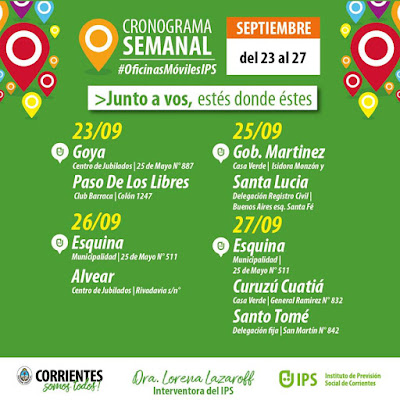 Se informa a la comunidad de Santa Lucía que este miércoles 24 de Septiembre estará presente en la localidad personal del Instituto de Previsión Social de Corrientes, atendiendo en una oficina del Registro Civil, ubicado en intersección de calles Buenos Aires y Santa Fe. Se atenderá en horario de la mañana.